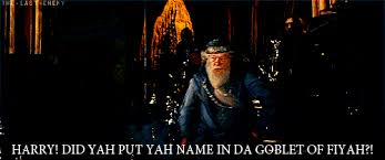 - Worst for last. Right after Harry gets picked to be in the Triwizard Tournament, all the heads of school, the minister, and Ludo come back to talk to Harry. They're all yelling at Harry and then “Did you put your name into the Goblet of Fire, Harry?” he asked calmly." That's Dumbledore. and please direct your attention to the adverb of how he said it. CALMLY!!!!!!! In the movie he spins Snape out of the way. Pushes Minnie into a wall. And then